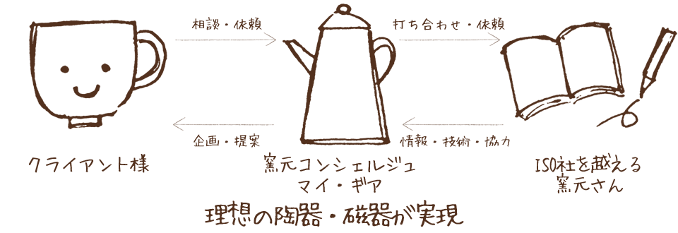 デザインや企画などのご要望に対して、材料と必要な技術を検討し、最も適した窯元さんへクライアント様に代わって依頼することで、理想の陶器・磁器をスピーディーかつ正確にカタチにします。